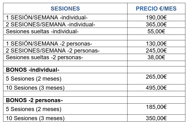 * El Precio mes incluye 4 sesión u 8 sesiones respectivamente. Las clases no canceladas con 24h antes, se verán abonadas íntegramente.